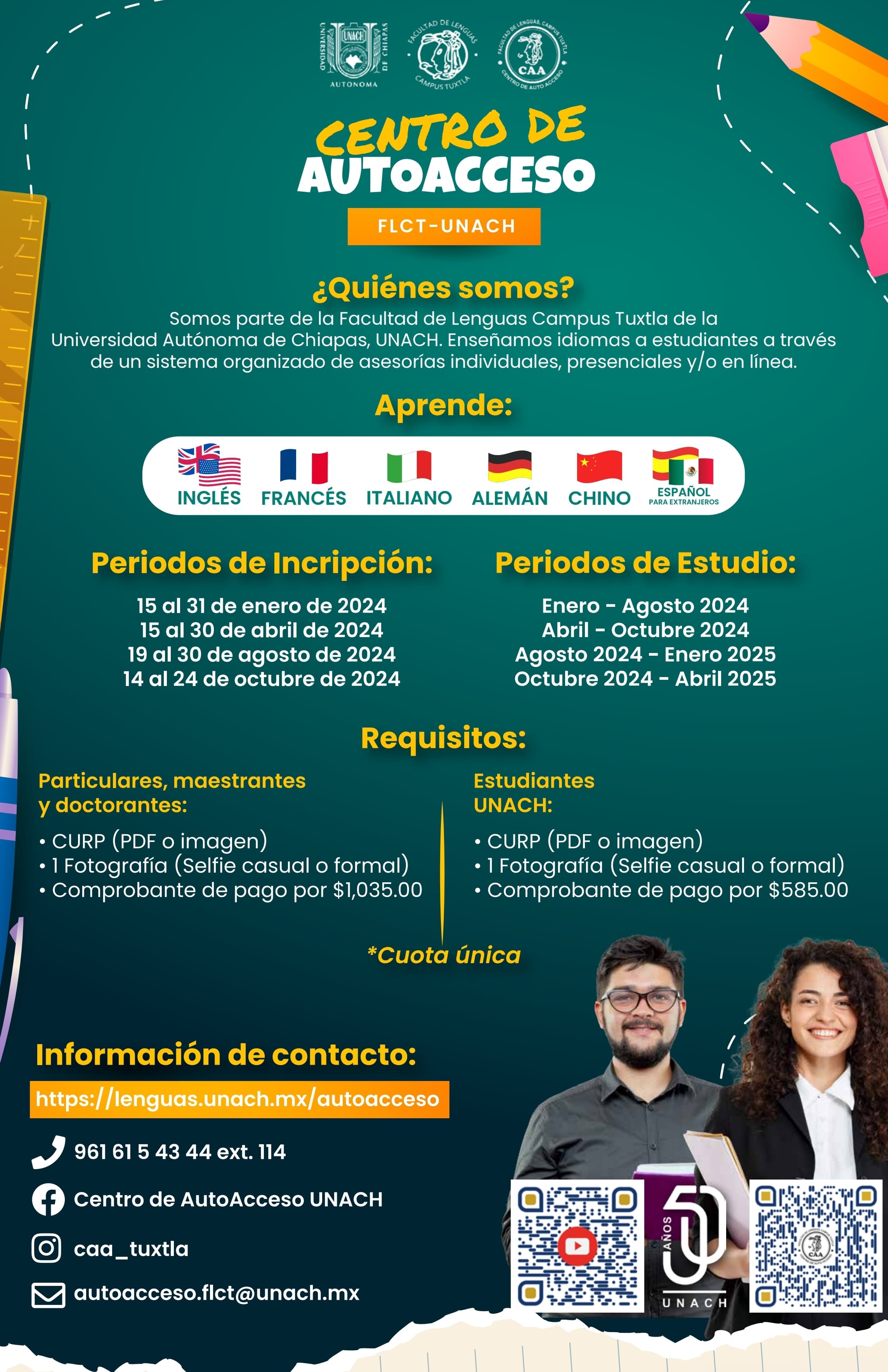 Somos parte de la Facultad de Lenguas Campus Tuxtla de la Universidad Autónoma de Chiapas, UNACH. Enseñamos idiomas a estudiantes a través de un sistema organizado de asesorías individuales, presenciales y/o en línea.