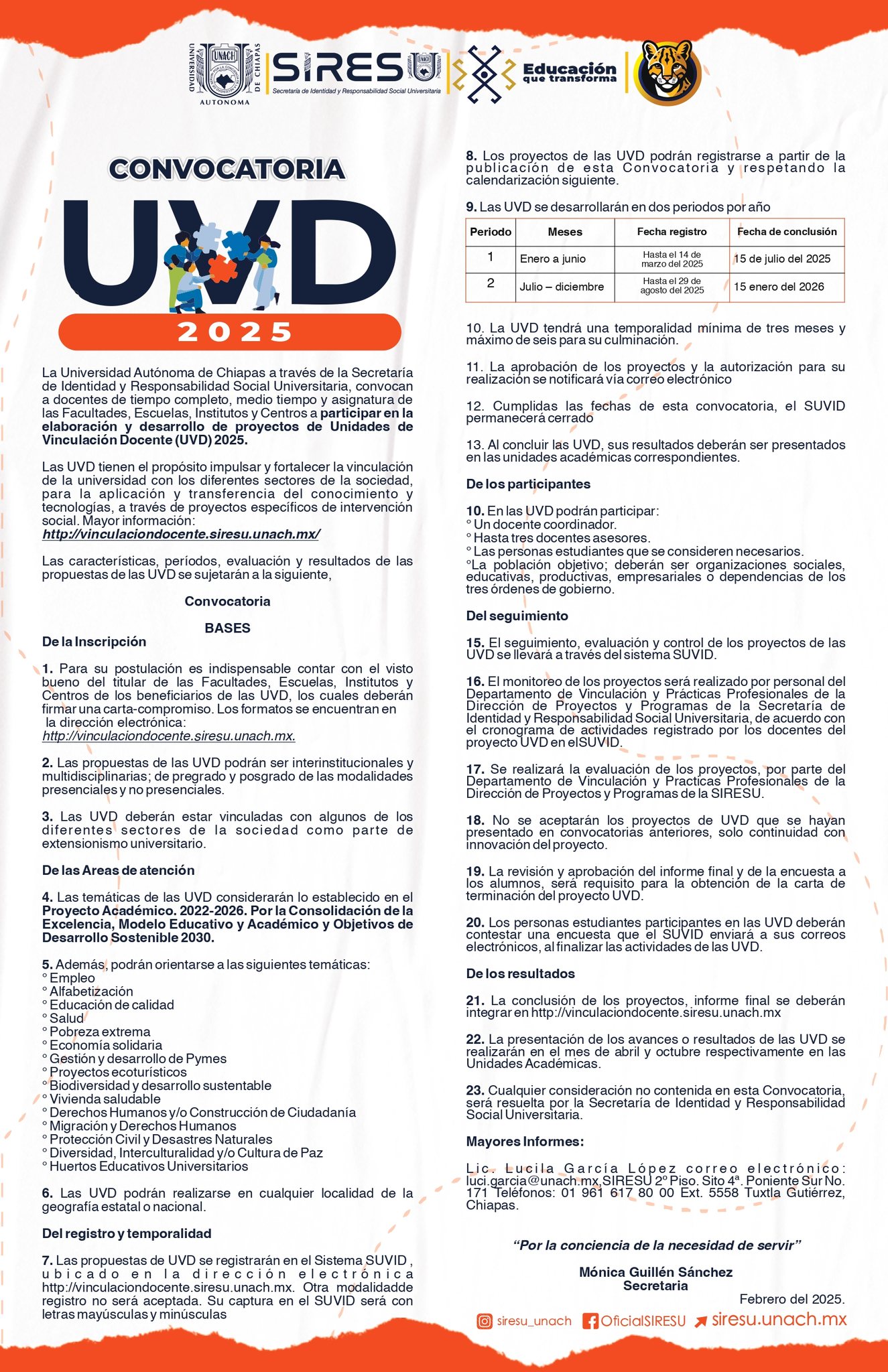 La Universidad Autónoma de Chiapas a través de la Secretaría de Identidad y Responsabilidad Social Universitaria, convocan a docentes de tiempo completo, medio tiempo y asignatura de las Facultades, Escuelas, Institutos y Centros a participar en la elaboración y desarrollo de proyectos de Unidades de Vinculación Docente (UVD) 2025.